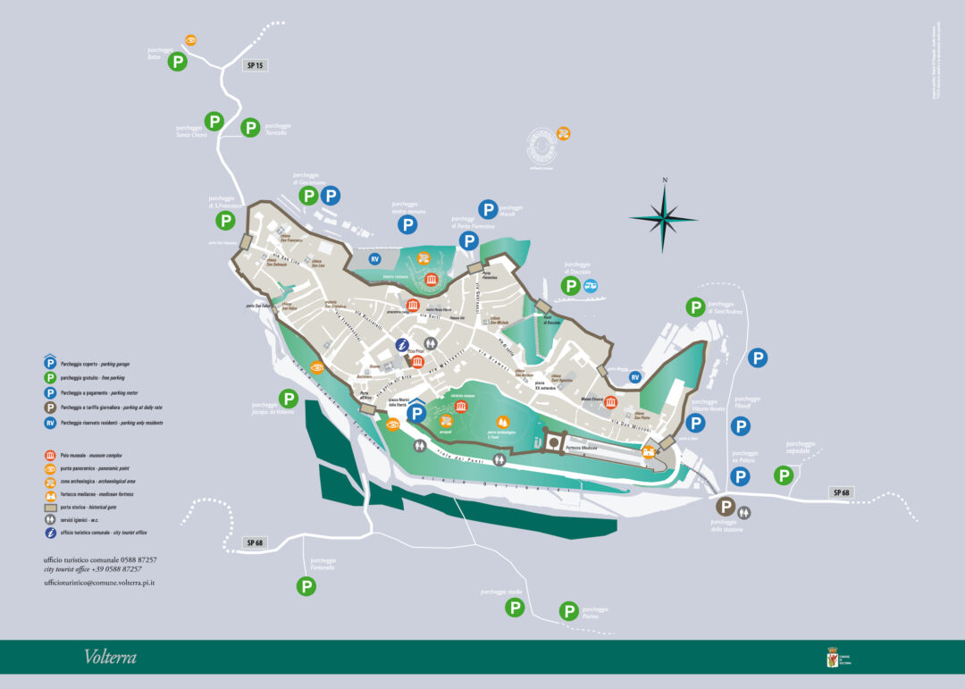 Mi sono recata a Volterra sempre con mezzi propri, a volte in macchina e altre in moto. Come ogni borgo antico toscano, il parcheggio può rappresentare un problema se lo si vuole trovare vicino al centro e poco costoso. A Volterra ci sono sia parcheggi a pagamento sia gratuiti, fate attenzione alle tariffe – giornaliere od orarie – e alle zone ZTL. Vi metto una pratica cartina qua sotto per orientarvi: